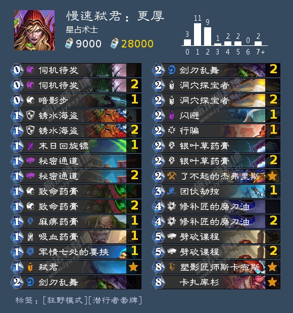 大家好,我是一个以法贼为主的玩家,同时还挺缺尘,于是在法师陨落后致力于贼的多形态开发,今天主要推荐两套娱乐用的慢速弑君贼,希望和志同道合的玩家讨论卡组意见,以及推广一下复古的弑君贼。原本只合了套正常快攻弑君,发现很容易打完手牌,我便想到:既然是不太稳定的快攻,何不把它当成一个慢速卡组使用呢?于是,我便研究较慢速的弑君贼,在这个月钻石分段与上个月的传说分段的休闲模式两个月测试了近100把,也在天梯打过一段时间,在这里分享最近我使用的两套形态: