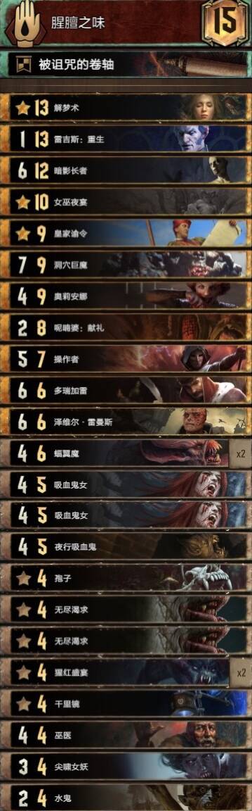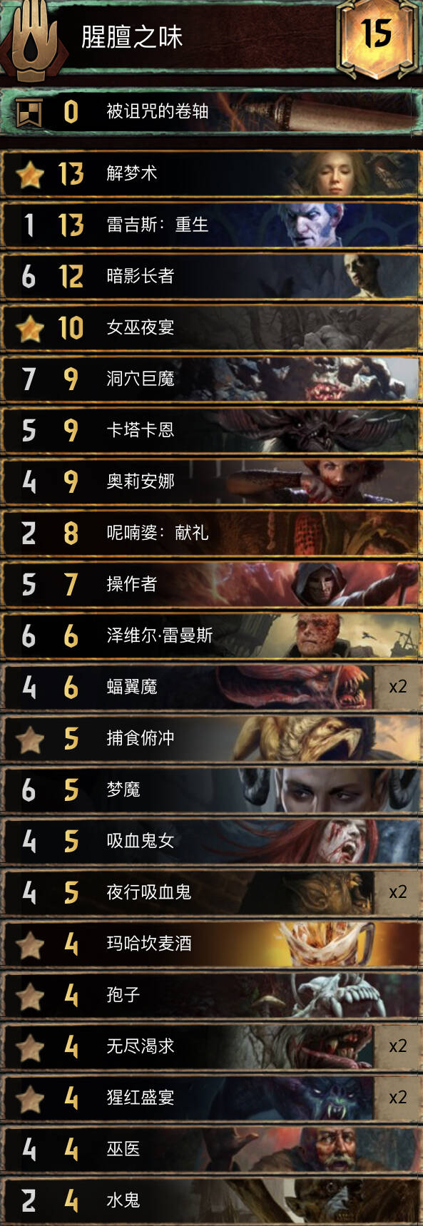 R1下的怪不要超过三个,一般是两个蝠翼魔加卫士或者长者。下蝠翼魔一定要配合立刻领袖,7点的蝠翼魔很难解。两个蝠翼魔站住后用流血牌加点,对面一般跟不了。进R2后女巫夜宴直接拉出,不要等对面清你的坟(如果对面墓地有遮蔽单位、大引擎之类的先用挖坟哥挖掉)。然后下长者、欧莉安娜直接打穿。注意R1千万不要下除了蝠翼魔之外的4点战力的其他单位,否则女巫夜宴可能拉出的不是蝠翼魔就血亏。这套牌比自闭不虚大部分其他卡组,害怕的是干扰墓地以及锁、大解(最擅长这种事的正是帝国,打上版本的状态帝国完全不可能赢),趁现在帝国的热度不是很高我赶紧上了职天。