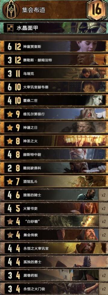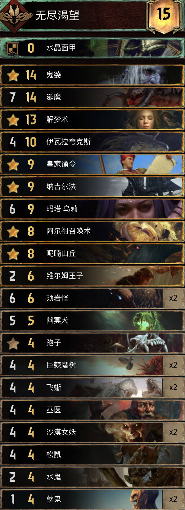 可替换卡位:碾压者或船员的一张换成独眼巨人加强大解能力,把两张艾恩艾尔征服者换成狂猎之犬来保证女巫夜宴拉出艾瑞汀