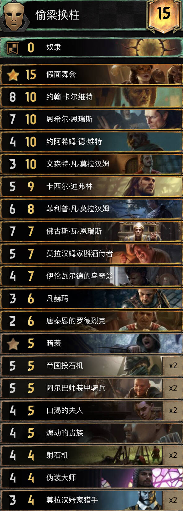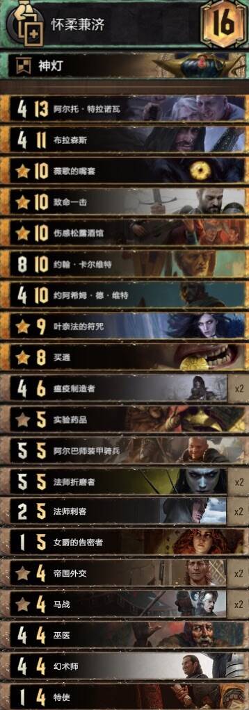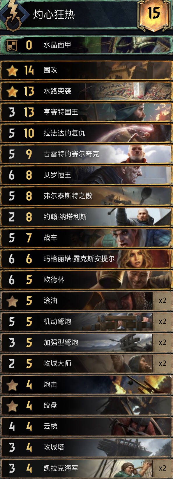 核心牌是大帝,舞会和菲利普,用夫人叠点(大帝和舞会可以分两小局下,算是双核);大帝要是被解了可以用太上皇赤诚顶替。一般只要运气不差r1可以拿到卡尔维特(尽早下),然后暗袭,凡赫玛和文森特用来解牌;没有其它牌叠装填时可以用投石机(两回合给一个夫人叠三点) 对局思路r1攒牌,先手至多一张牌差拿下r1,否则果断过牌;后手平牌拿,核心牌尽量不上,实在有必要就视情况下其中一个,一张牌要是追不齐就果断留牌过牌。R2如果有r1可考虑莽穿,否则尽量平牌拿下进r3 。基本上进r3有核心牌就可以自由发挥了。