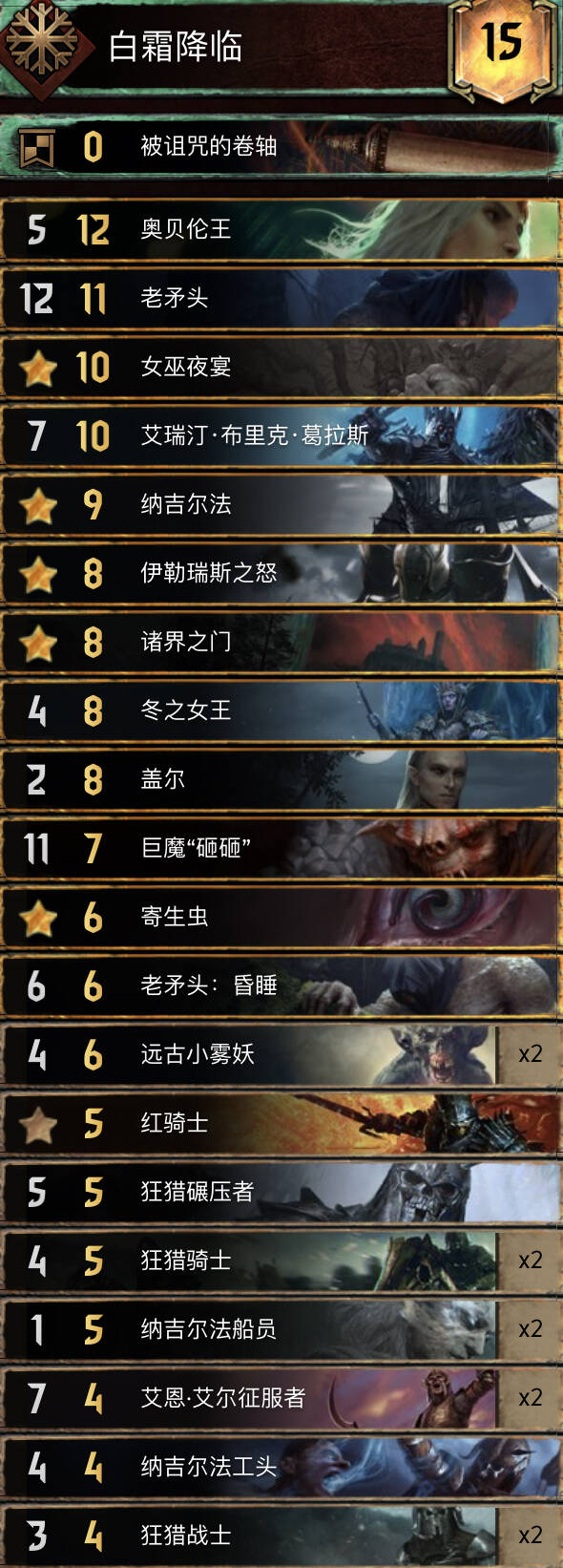 思路:R1老毛头,砸砸冬之女王外加一系列铜卡狂猎赢。如果对面铜卡战力小,R2可以女巫夜宴酌情逼牌。R3拍小雾妖下霜。