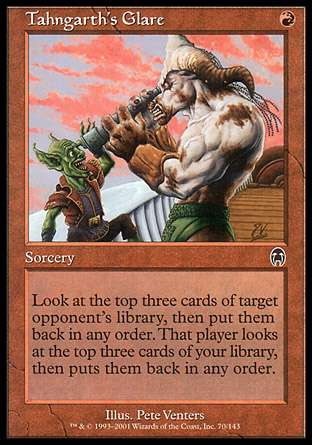 为什么烂? 我在撰写此名单时将它和编纂索引以及天眼通分开处理了。这两张牌效果不太好,但至少不会像坦格尔斯的怒视伤害你自己。一费安排对手牌库顶其实是个不错的效应。不过你的对手也会同时把你安排一番。在限制赛里,它可能会让你和对手一起难受,但在构筑里,基本等于扔一张牌然后自己坐牢。