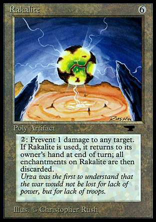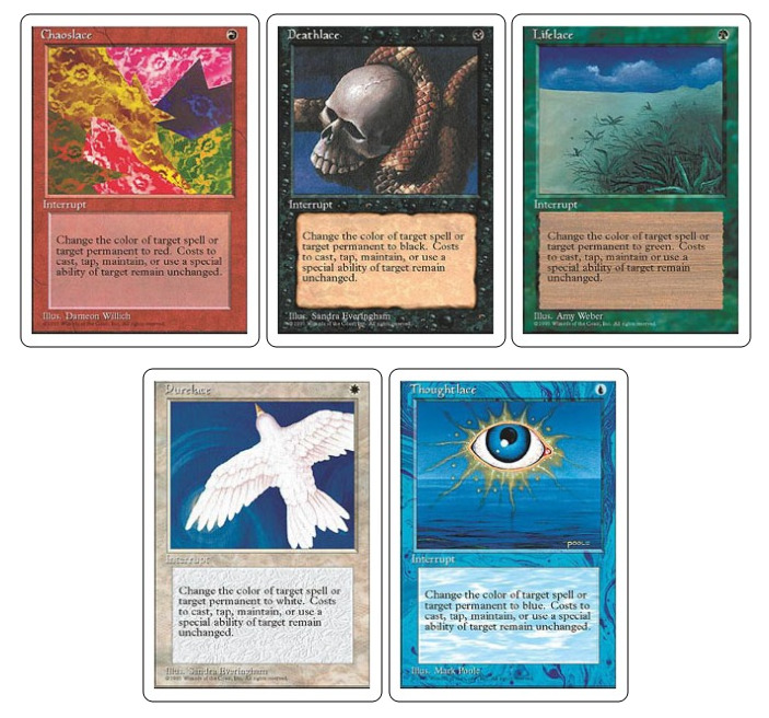 为什么烂? 这些牌曾经是旧补充包里埋的地雷,因为它们都是稀有卡。它们足足有五个,而且每个都没有用。红色和蓝色的可以配合红、蓝元素冲击波。黑色和白色的可以和反白反黑的生物互动。绿色的?可能和艾斯林小仙灵一样“有用”。试想一下,在alpha包里开个这。(犀牛:我可能会选择死亡。)