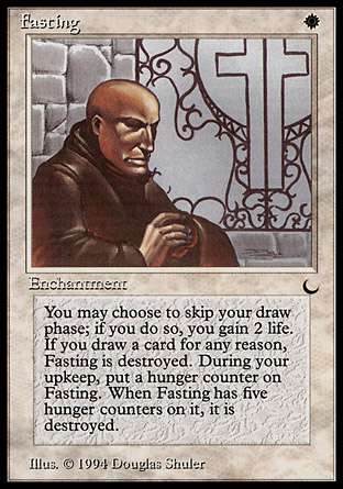 为什么烂? 白色是万智牌中的主要回血颜色。每个系列中都会有几张白牌能让你回血。禁食则是万智牌里最差的回血牌之一(剧透预警:注意这个“之一”)。哪怕对手强迫你抓一张牌,禁食也会被牺牲掉。而且它五个回合后自己也会离开,天下真是没有不散的挨饿。