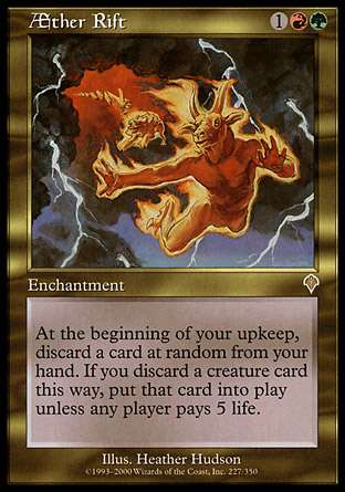 (结界,在你的维持开始时,随机弃一张牌。如果你以此法弃掉一张生物牌,除非任意牌手支付5点生命,否则将之置入战场。)