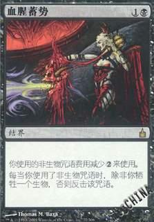 为什么烂? 如我之前提到的,在这个表单上提及组合技组件是很冒险的。血腥蓄势是张自相矛盾的牌。你需要场上有生物来确保自己的咒语不会被反击,但它却帮助你施放非生物咒语。有些情况下,它会卡住你的计划,让你什么都干不成。