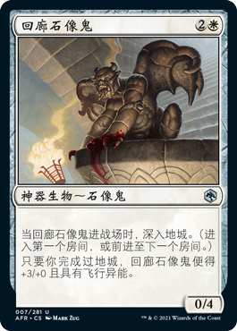 这个机制只能和DND系列的牌互动,在很大程度上没法融入整个游戏。威世智曾经很担心过度推广这个机制会导致无聊且重复的游戏模式。所以所有地城牌几乎都有较差的身材。回廊石像鬼是其中最糟糕的一张。3费0/4而且几乎没有机会变成3/4飞机。地城机制本身不够强,导致回廊石像鬼进场时给你回1血或者占卜1显得无关紧要。