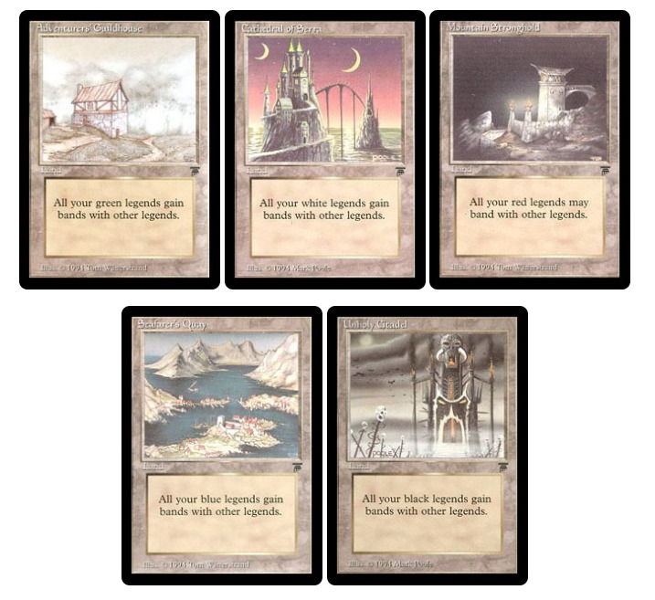 和其他生物bands还不是banding。Bands这个伪banding异能比banding本身更令人困惑。在2004年的时候,这五张地进入了我评选的最烂top10。这些地都不能产费,所以理论上,你浪费了下地的机会,给你的传奇增加了一个没用的异能。
