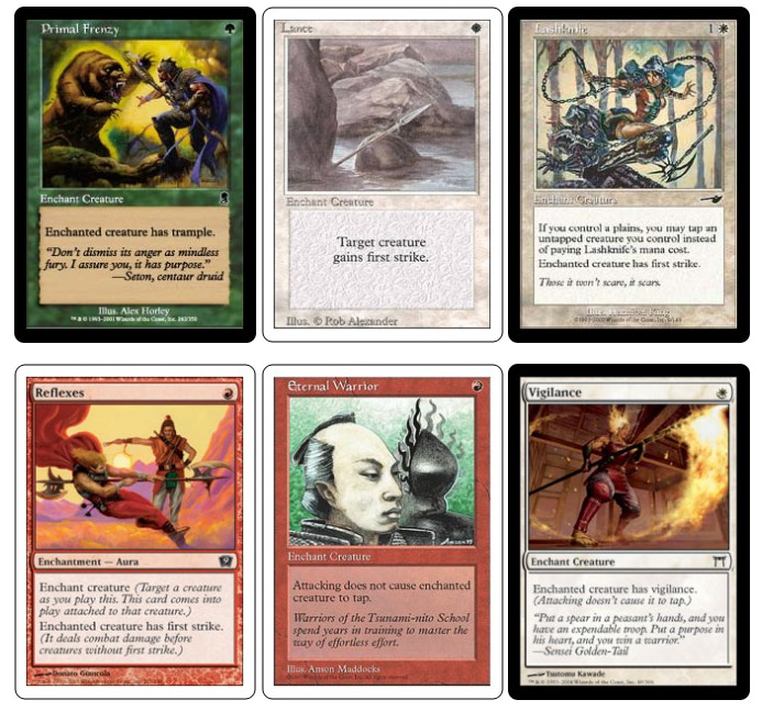 为什么烂? 灵气有个缺点就是容易被一换二。这意味着你贴的那些灵气最好值得让你冒险。这也就意味着有些异能作为灵气是完全不值当的。践踏、先攻和警戒这些异能就是不值得单独成为灵气牌的异能。