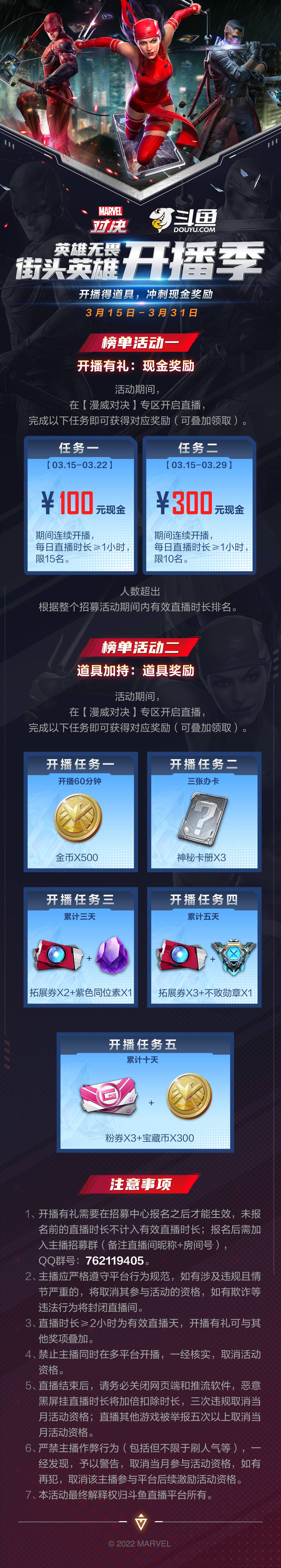 榜单活动一:活动期间在斗鱼《漫威对决》专区连续开播,每日直播时长≥1小时,即有机会赢取现金奖励!