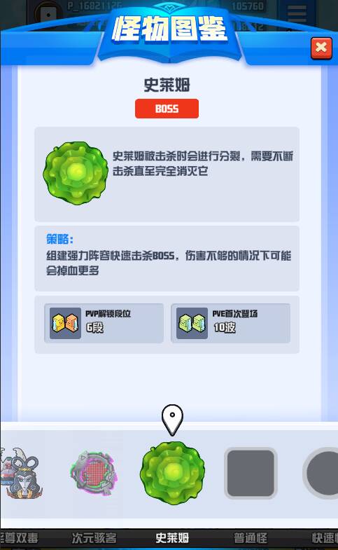 三月主题季为我们带来全新挑战的BOSS是史莱姆,它在被击杀时会进行分裂,你需要不断击杀分裂出来的史莱姆直至将其完全消灭。这个BOSS的机制十分简单易懂,也没有破坏方块阵容的能力,却全面地考验了大家阵容的单体输出与群体输出能力,可谓是在设计上重剑无锋、大巧不工的一个BOSS了。