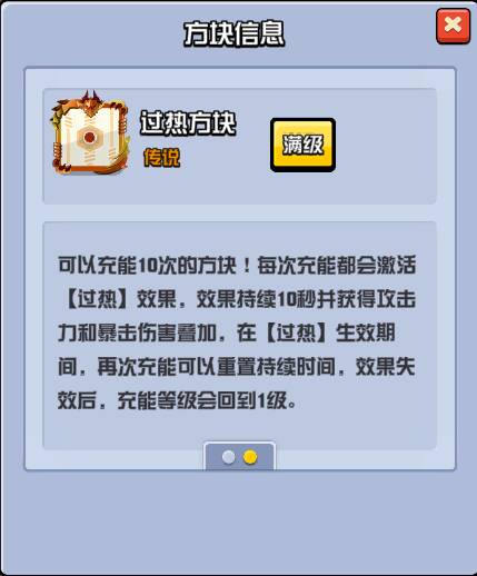 三月主题季的传说方块是[过热方块],方块效果为可以充能10次,每次充能激活【过热】效果,效果持续十秒并获得攻击力和暴击伤害叠加,在【过热】生效期间,再次充能可以重置持续时间,效果失效后充能等级回到1级。