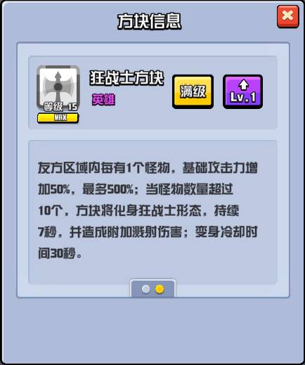 新版本的全新英雄级方块是[狂战士方块],效果为友方区域内每有一个怪物,基础攻击力增加50%,最多可以强化至500%!当怪物数量超过10个时,方块还将化身为狂战士形态,在7秒的持续时间内攻击造成溅射伤害,变身冷却时间为30秒。