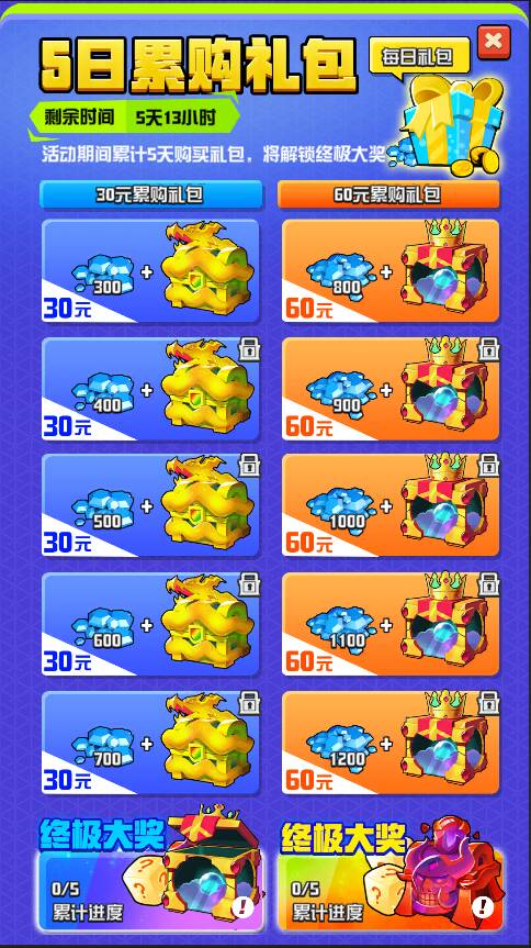 三月主题赛季新开启,当然也少不了相应的全新活动帮助大家补充游戏资源、获取全新方块。首先是每日累购礼包,每天都有30元和60元档的礼包可以购买,如果你累计五天都购买了某一档次的礼包,就能获得诱人的终极大奖!