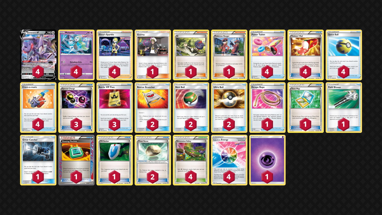 卡组的打手,其技能是根据自己场上所有宝可梦携带的汇流能量数进行计算的,在场上有3或4个汇流能量的情况下可造成210/280点伤害,且由于自身是一奖卡,在奖品交换上占优。