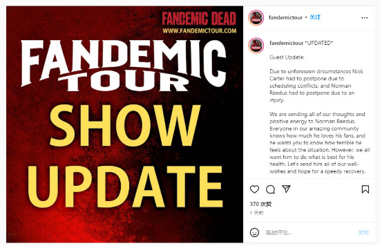 3月15日,Fandemic Tour官方宣布因为诺曼·瑞杜斯受伤而推迟活动。此外,《行尸走肉》第11季最后一集的拍摄也被推迟。