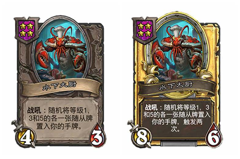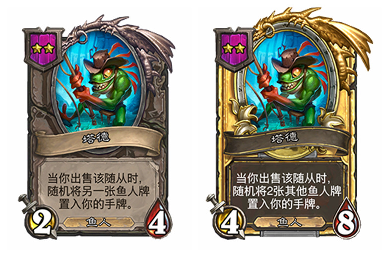 - 2星2/4鱼人,当你出售该随从时,随机将另一张鱼人牌置入你的手牌。