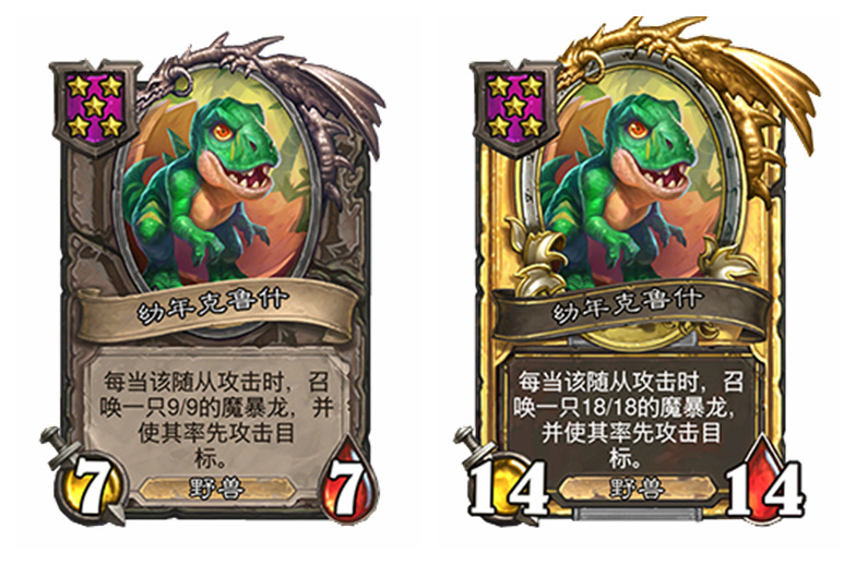 - 5星7/7野兽,每当该随从攻击时,召唤一只9/9的魔暴龙,并使其率先攻击目标。