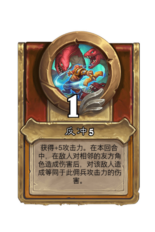 142295:获得+5攻击力。在本回合中,每当有敌人对相邻的友方角色造成伤害时,对该敌人造成等同于此佣兵攻击力的伤害。
