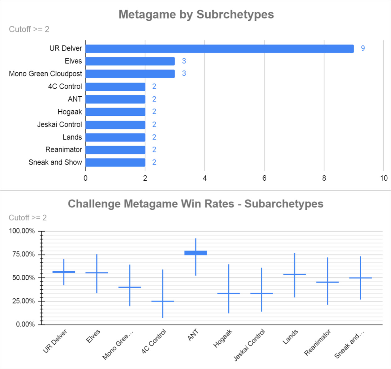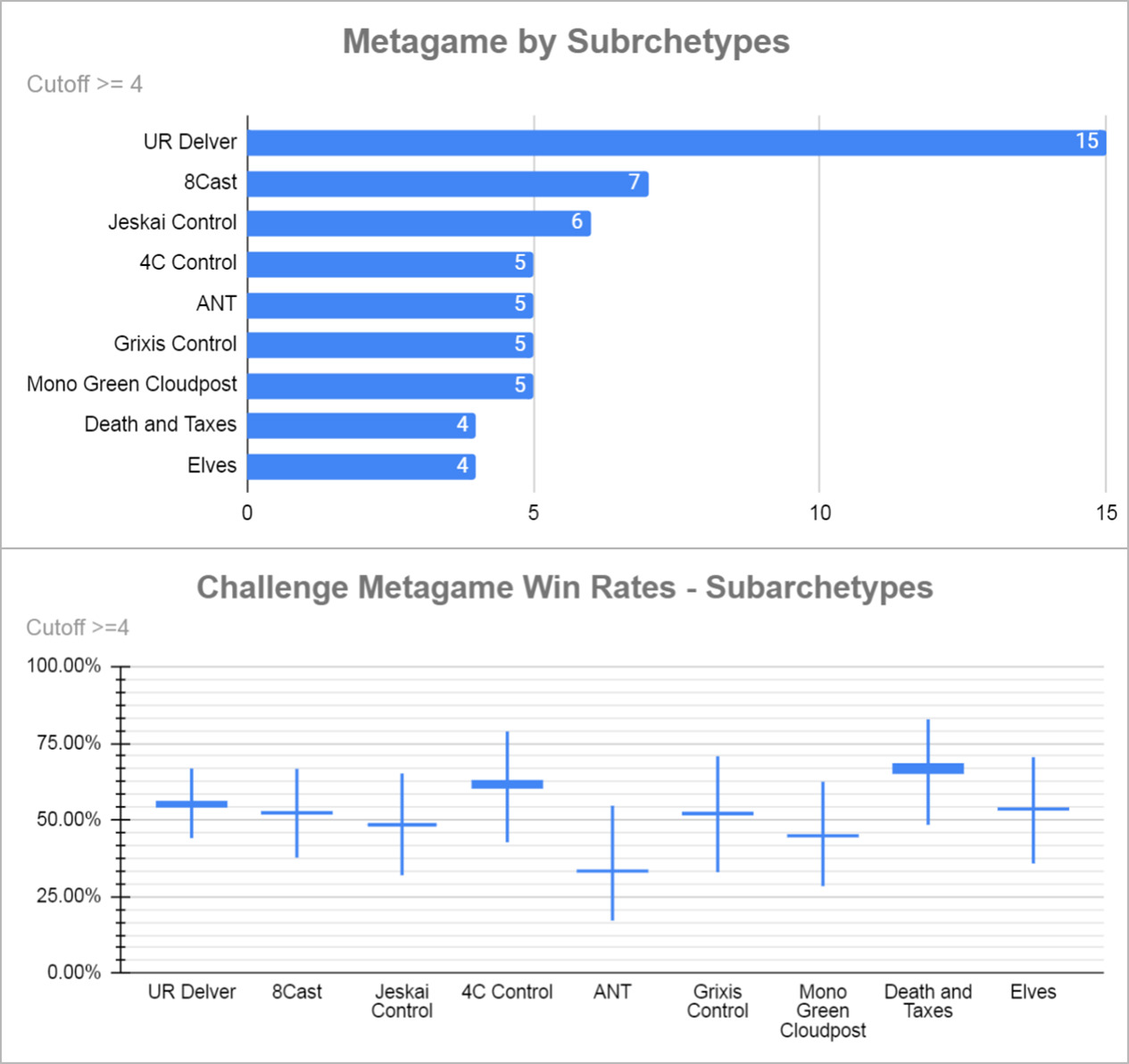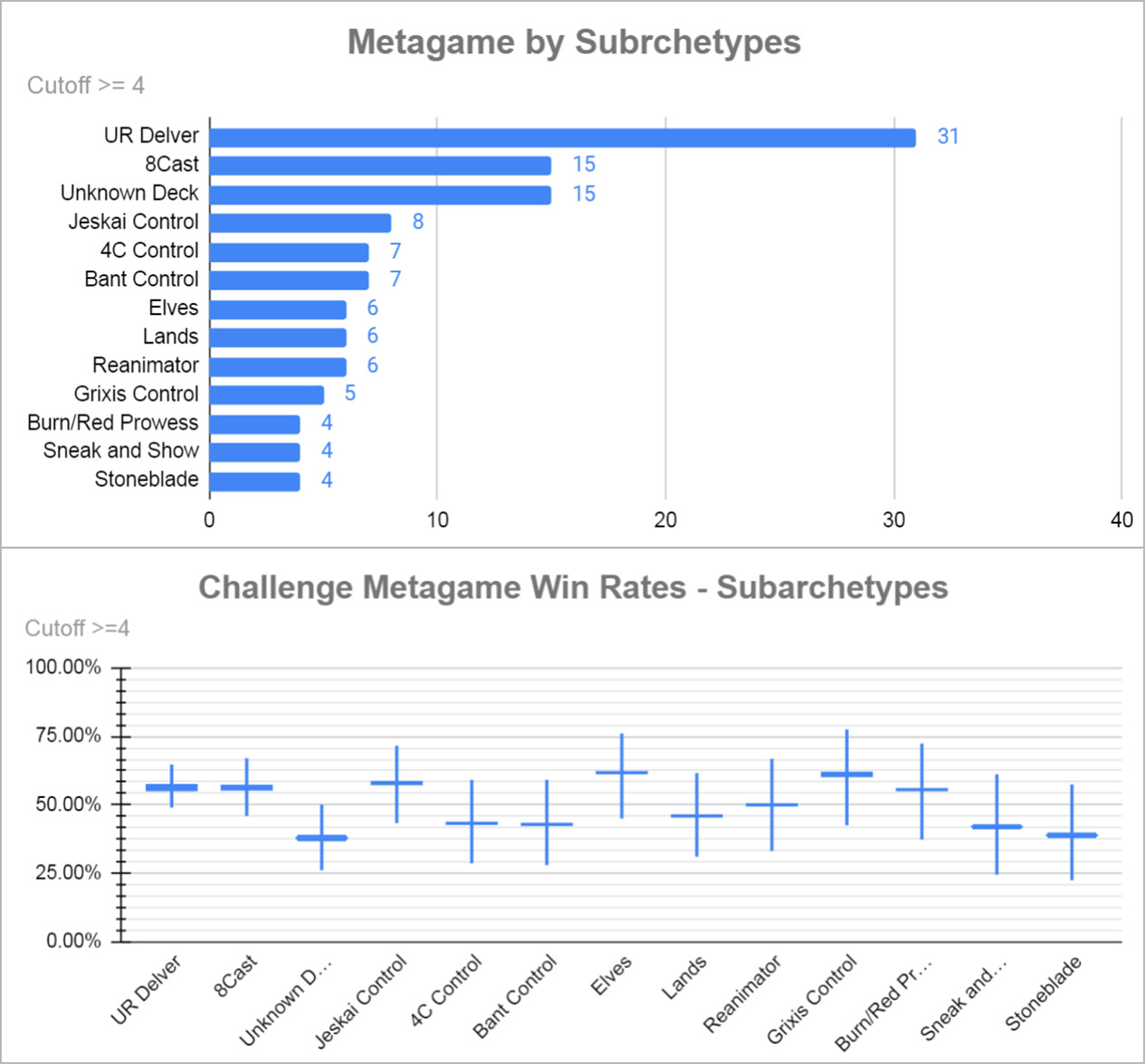 比赛的全部信息可以在 MTGMelee 赛事网站里找到,虽然有一部分参赛者的套牌没有被收录,但这些数据已经足够多让我们绘制出表格来了解 meta。红蓝掘密师还是那个占比非常高的套牌,并且表现优秀。此外,8Cast 也很受欢迎且胜率较高