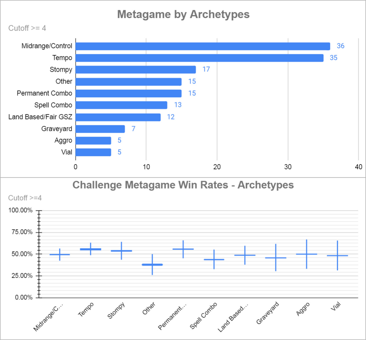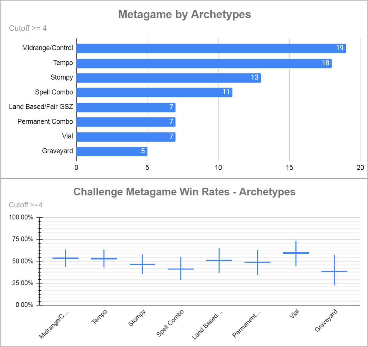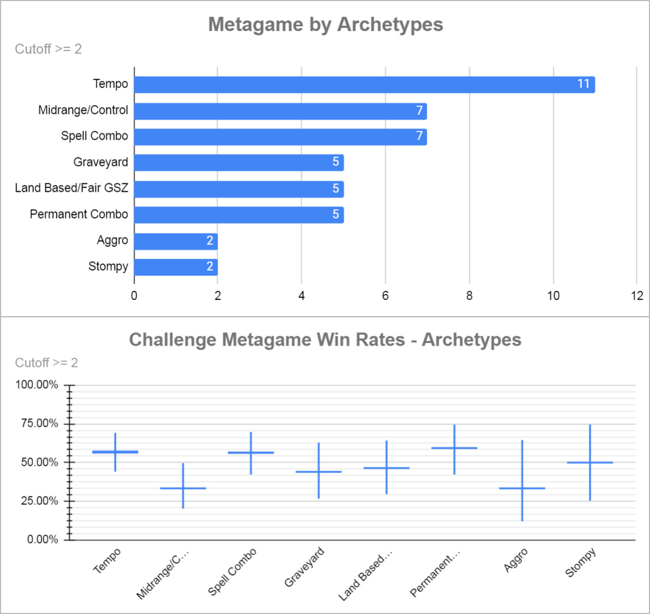 比赛的全部信息可以在 MTGMelee 赛事网站里找到,虽然有一部分参赛者的套牌没有被收录,但这些数据已经足够多让我们绘制出表格来了解 meta。红蓝掘密师还是那个占比非常高的套牌,并且表现优秀。此外,8Cast 也很受欢迎且胜率较高