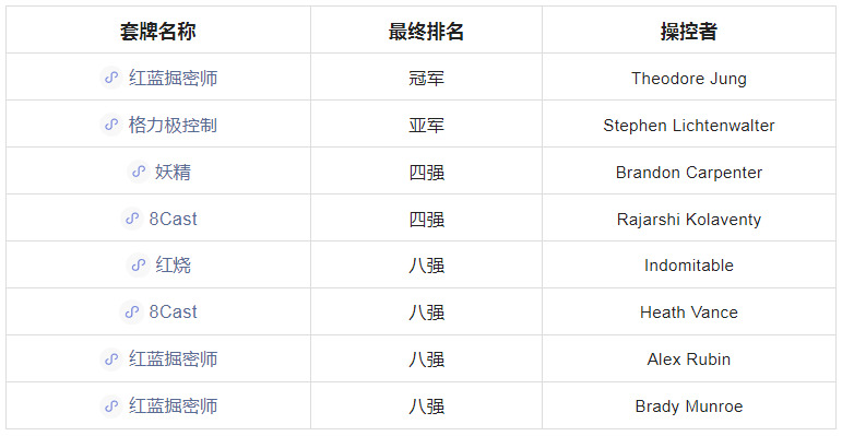 不出所料红蓝掘密师最受欢迎并且表现稳定,数量排在第二的是 8Cast,表现也不错。四色控制和死税有非常高的胜率。比赛共进行7轮瑞士轮+八强单淘汰,下面是最终的八强排名