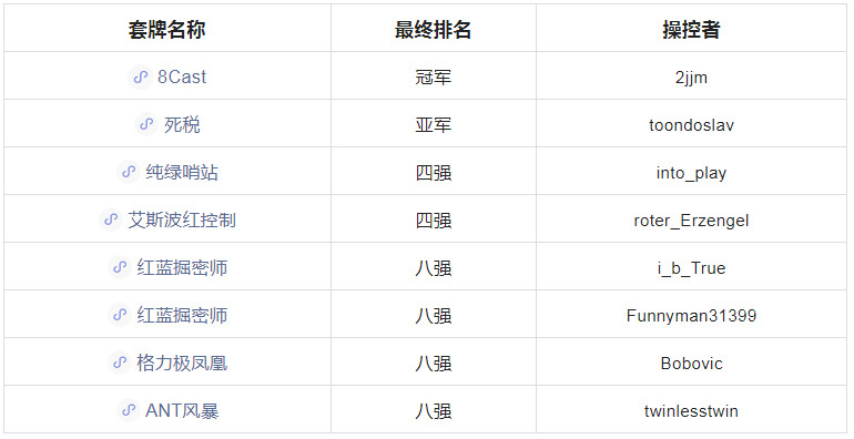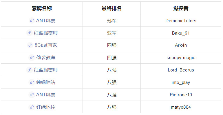 红蓝掘密师表现稳定,但这场比赛真正的赢家是 ANT 风暴,有两位牌手选择,全部进入八强。比赛共进行6轮瑞士轮+八强单淘汰,下面是最终的八强排名