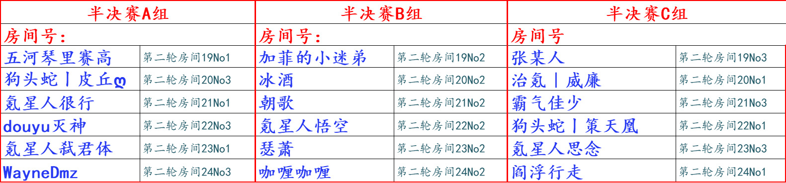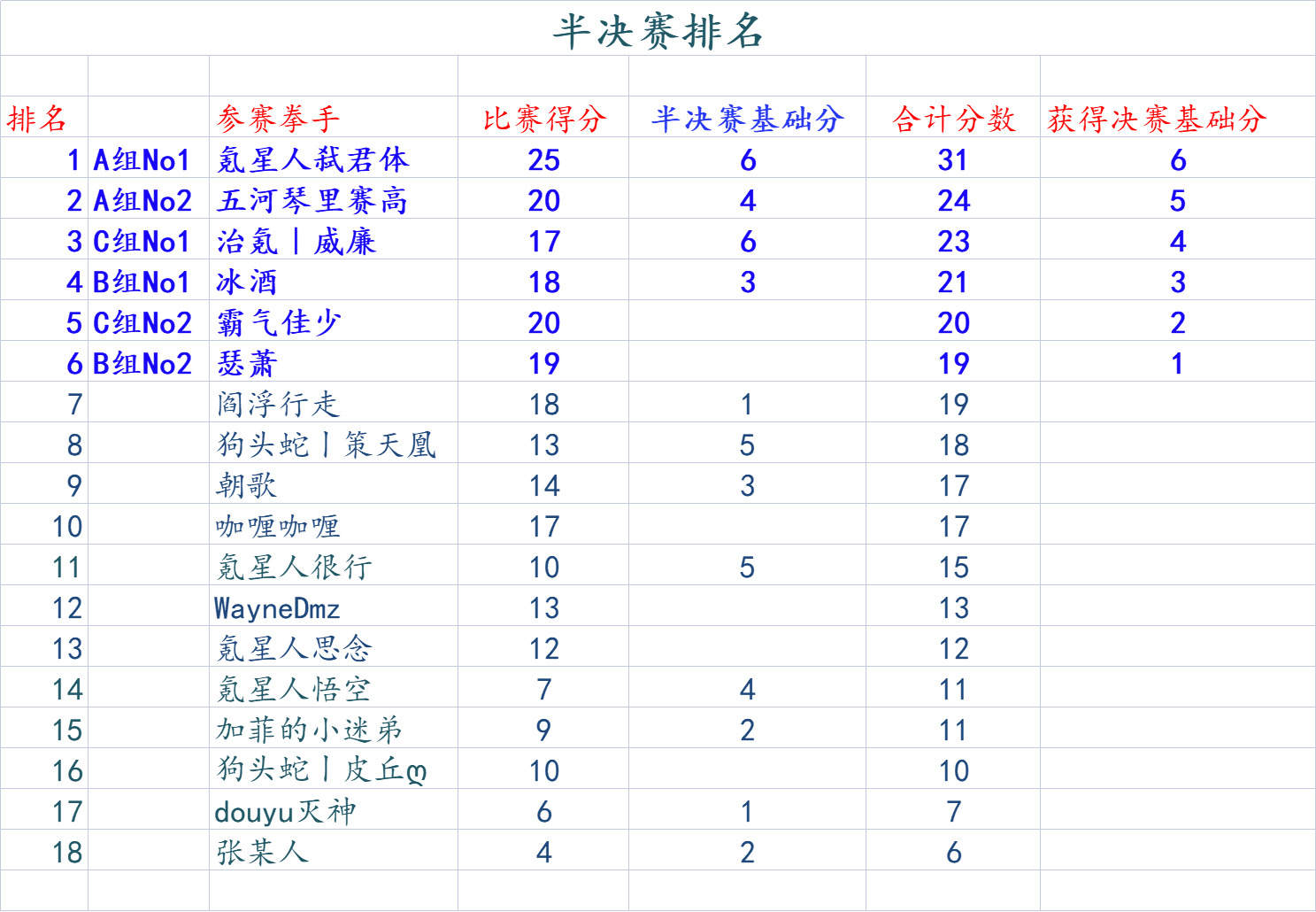 本次比赛一共邀请了72位王者段位的玩家参与了角逐,比赛异常精彩,昨日初赛两轮比赛结束后,有18人进入了半决赛:
