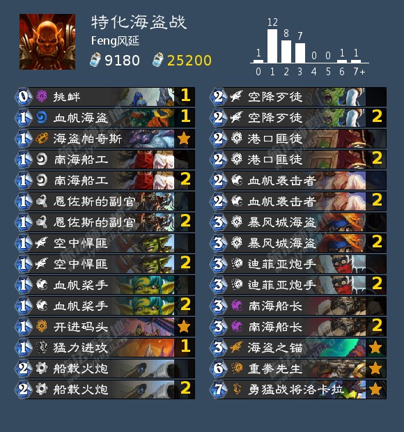 暴风城海盗:中规中矩,身材扎实。快攻内战战况激烈,故带两张(视环境进行增减)。可配合迪菲亚炮手和挑衅。