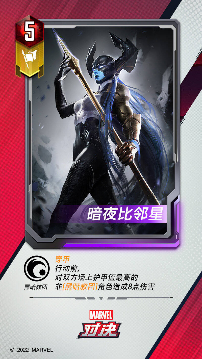 【暗夜比邻星】在行动前,她将对双方护甲值最高的非【黑暗教团】防御型角色发起进攻,穿透护甲,直击要害,将敌人的铜墙铁壁一一击溃!
