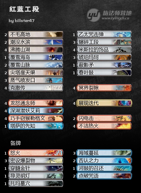 可能会有小伙伴不太熟悉辗碎工段这套牌,这套组合技的基本循环是琥珀玛珂+辗碎工段+冥界裂隙,这样一来,可以达成“产费→磨3张→放逐3张0费释放玛珂→重置工段→产费→...”的循环,最直观的结果就是你有无限费和不太多数量的坟场以及一个空空如也的牌库和一个丰满的放逐区,最终放逐掉你仅有的几张坟场中的3张,用你庞大的法术力池释放一张塔萨的先知,就直接获得胜利了。这套牌在新系列发布之后其实是有一些波动性调整的,先是加入了复数张实界晶片,想着是能通过使用牌库顶的方式增强自己循环的效率,然而实际上这么做问题点很多,一是实界晶片是一张相当拖沓的单卡,他会延缓你的致胜回合数,这点对于辗碎工段而言是很致命的;其次是,这张卡有点鸡肋的意味,要赢的时候不需要,赢不了的时候不能救命。于是乎,这套辗碎工段也直接忽略了NEO变回了之前的模样,效果也是有目共睹,获得了当场比赛的第二名,输给了备牌有3张黑地脉的老邢(这不巧了么~)。那不论如何,这套牌大概就是辗碎工段最好的模样了~