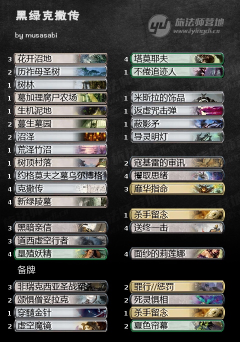 这套黑绿克撒传中速基本是之前黑绿磐石的底子,作为双色法术力基础优秀,混入了一组克撒传作为中速的额外维度,再简简单单带了些克撒传附属小神器,这么一套中速滚雪球就成了。套牌中亮点不少,除了面纱的莉莲娜不出意外的回归之外,垦殖妖精是个很有意思的思路,不仅可以作为调色出现,还能主动把克撒传导进场,靡华指命的使用也让人眼前一亮。整体是一套很有自己想法的套牌,感兴趣的小伙伴可以自行尝试。