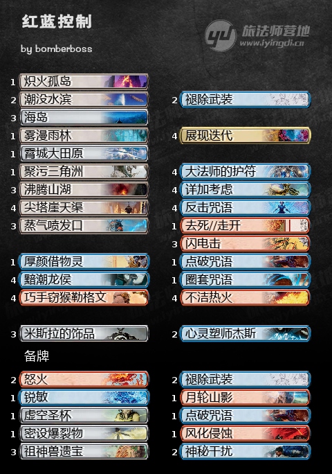 惊了,这套牌竟然没有蓝月亮!这大概是一套没有带腥红之月的蓝月亮或者是一套没有带龙怒通念师的红蓝龙侯,但是也正是如此,这套牌才偏向于控制思路。本来看他是挑战赛15名之外的名次,没想着拿出来看,结果这位pro在周一的MCQ中用同样的套牌获得了当场第四的好成绩,所以就拿来给大伙品鉴一下。控制套牌带猴其实并不是前无古人,之前几周就出现过一套格利极控制主牌带了一组猴,毕竟控制牌库顶也是一种控制嘛。此外,除了主牌没有带腥红之月之外,其他部分基本与蓝月亮类似,套牌整体的节奏也是会偏慢的。