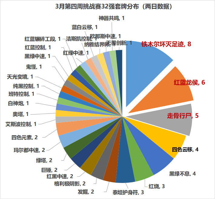 如开头所说,本周进入32强数量最多的套牌是铁木尔坏灭足迹,共有8套;第二名是红蓝龙侯,共有6套进入32强;第三名很意外的是走骨行尸套牌,这种组合技套牌在中速牌横行的环境里一定会比之前版本更加吃香。