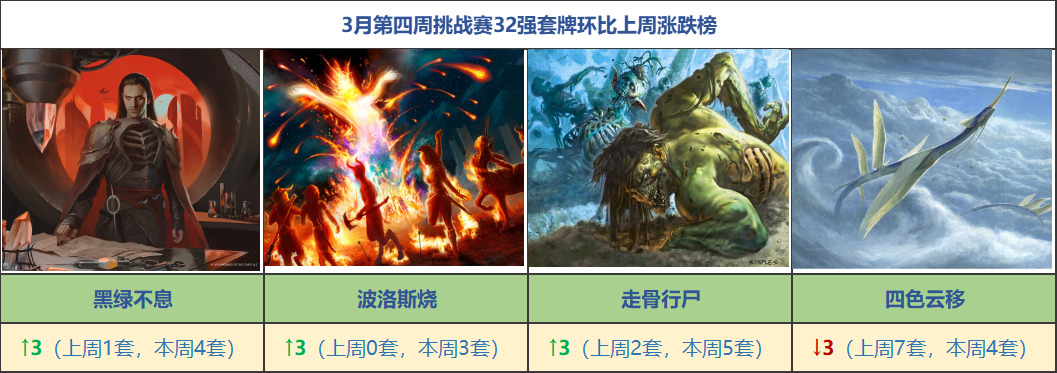 单套牌涨幅方面,本周黑绿不息、红烧、走骨行尸均环比上周新增3套牌进入32强;下降方面,四色云移套牌环比上周减少了3套,本周仅有4套高胜套牌: