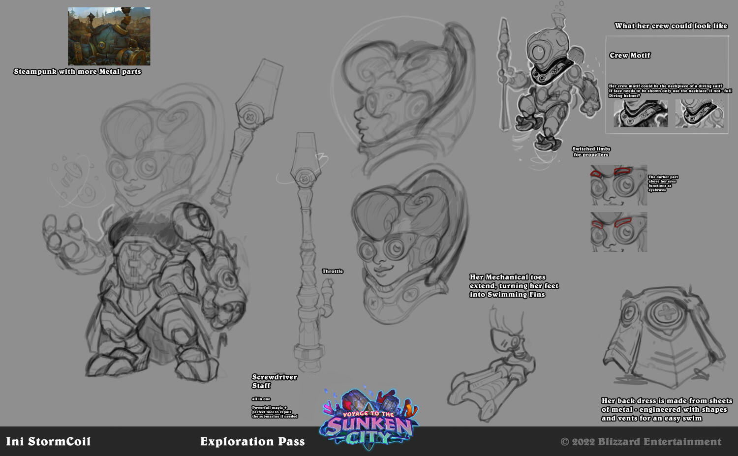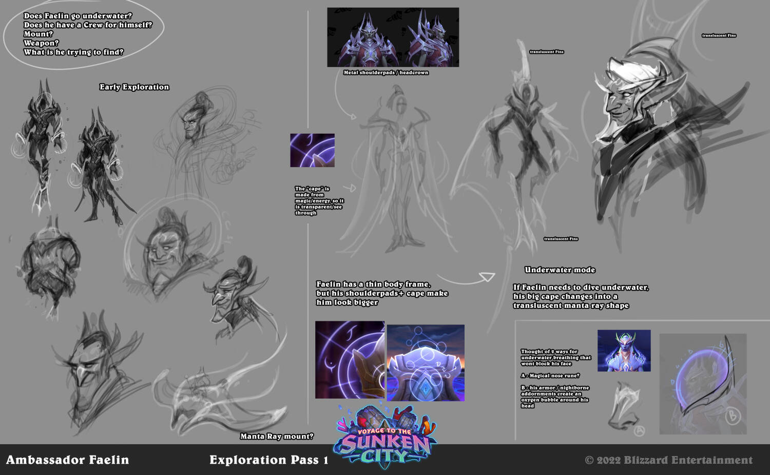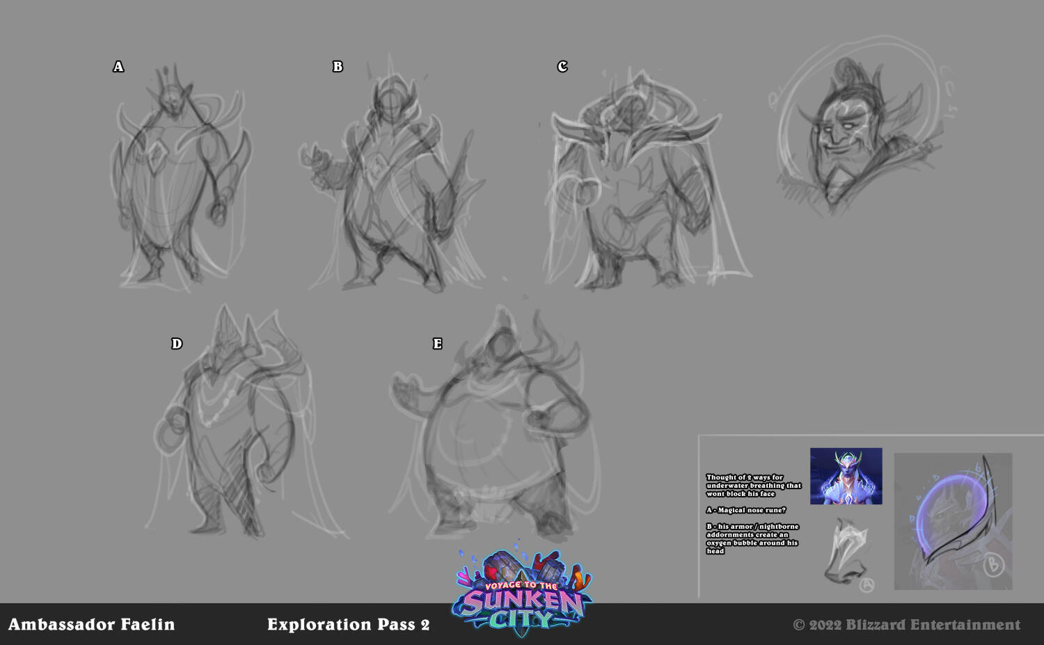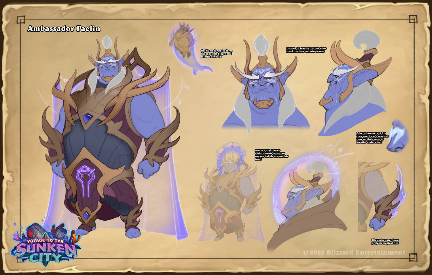费林大使的草图中,最初有水下呼吸设计的设计选择,并且还不能挡住他的脸:1是魔法符文,2是他的夜之子盔甲装饰在头部形成一个奥术魔法泡泡。