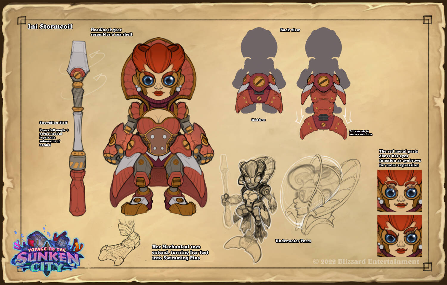 尽管最初设计费林的身体很瘦弱,但他的肩甲和头冠依然让他的身材看起来很魁梧。如果他需要潜水,他的奥术斗篷会变为半透明的蝠鲼形状。