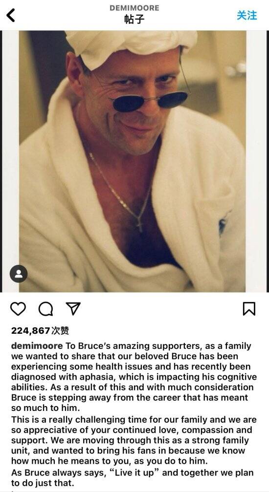 布鲁斯·威利斯的家人,包括他的妻子艾玛·赫明和前妻黛米·摩尔在INS发布联合声明。表示最近布鲁斯最近被诊断出患有失语症,而这影响了他的认知能力。因此,经过深思熟虑,布鲁斯·威利斯决定退出演艺生涯。