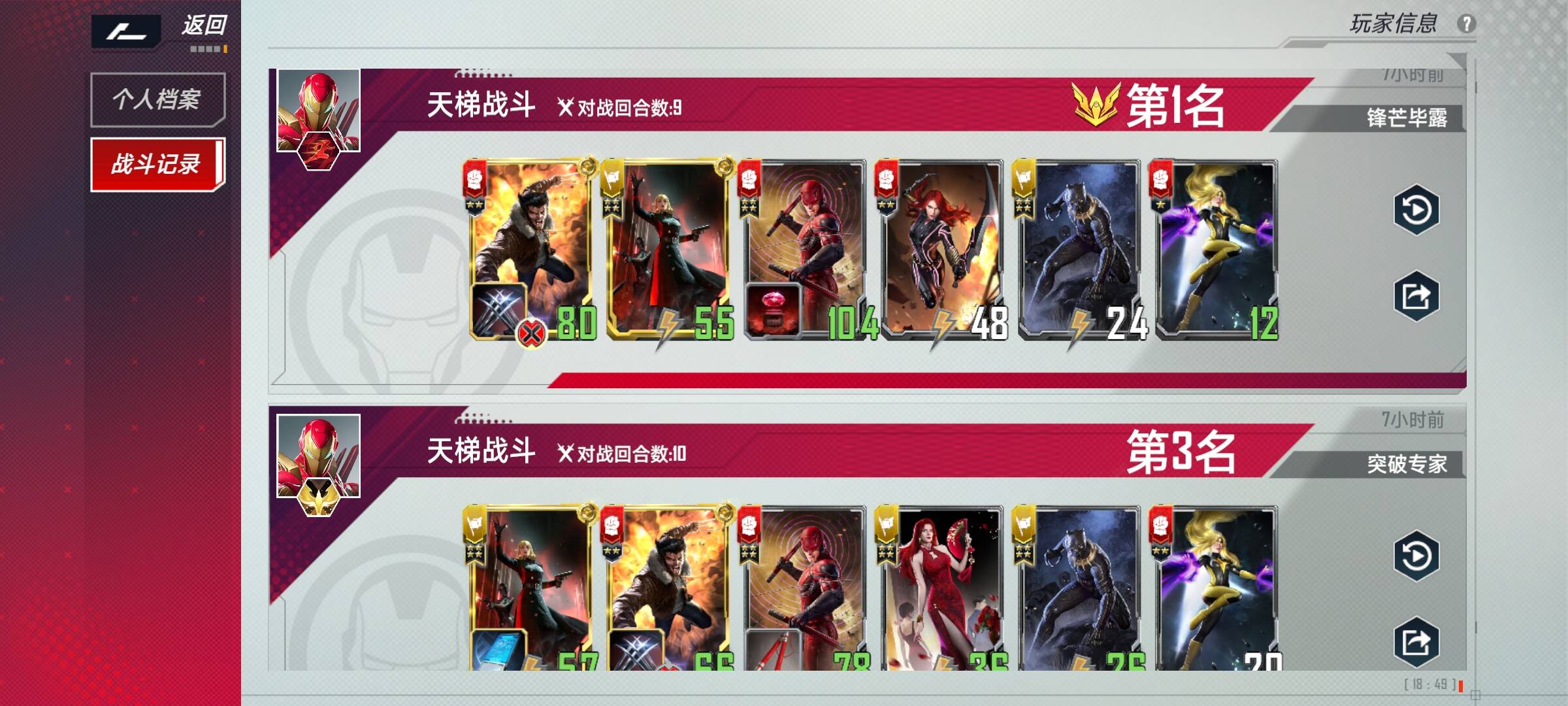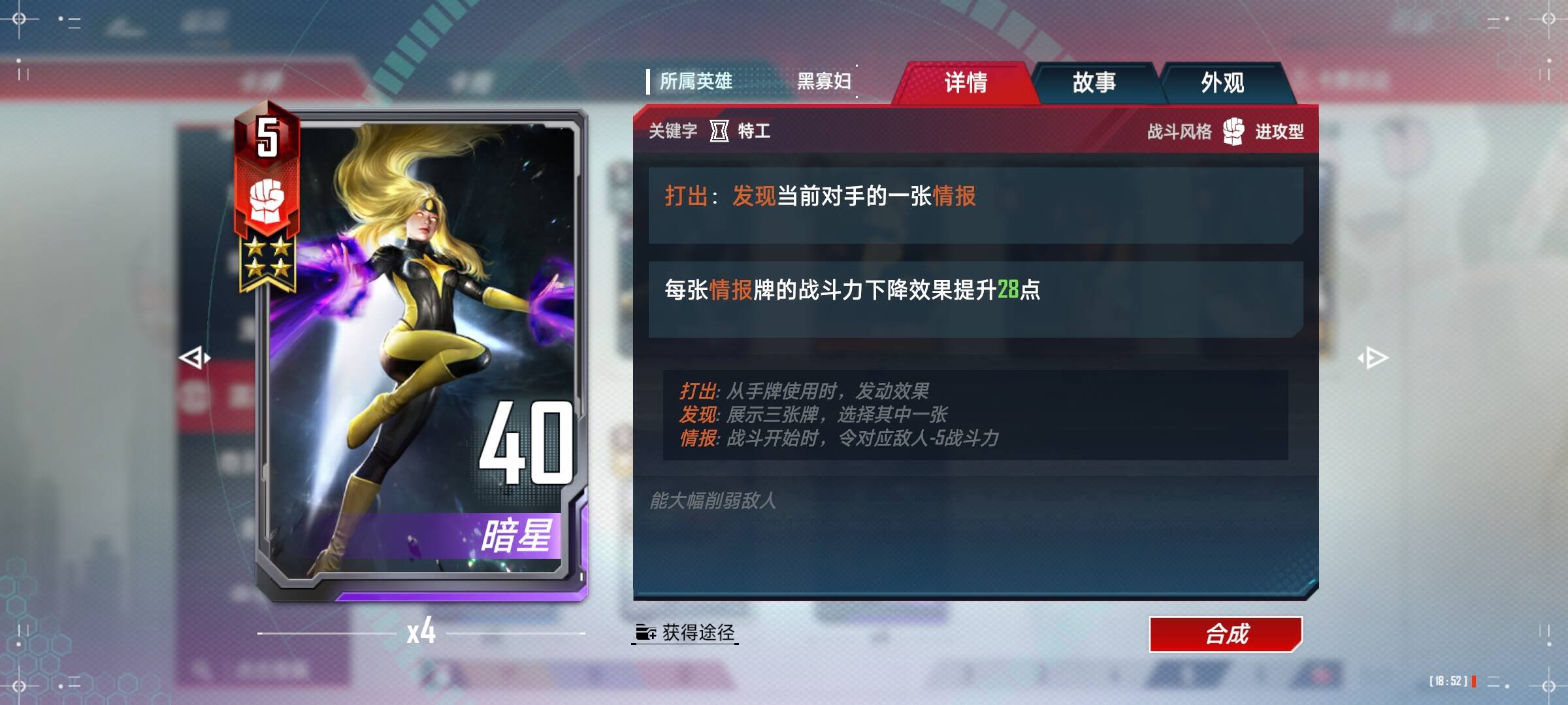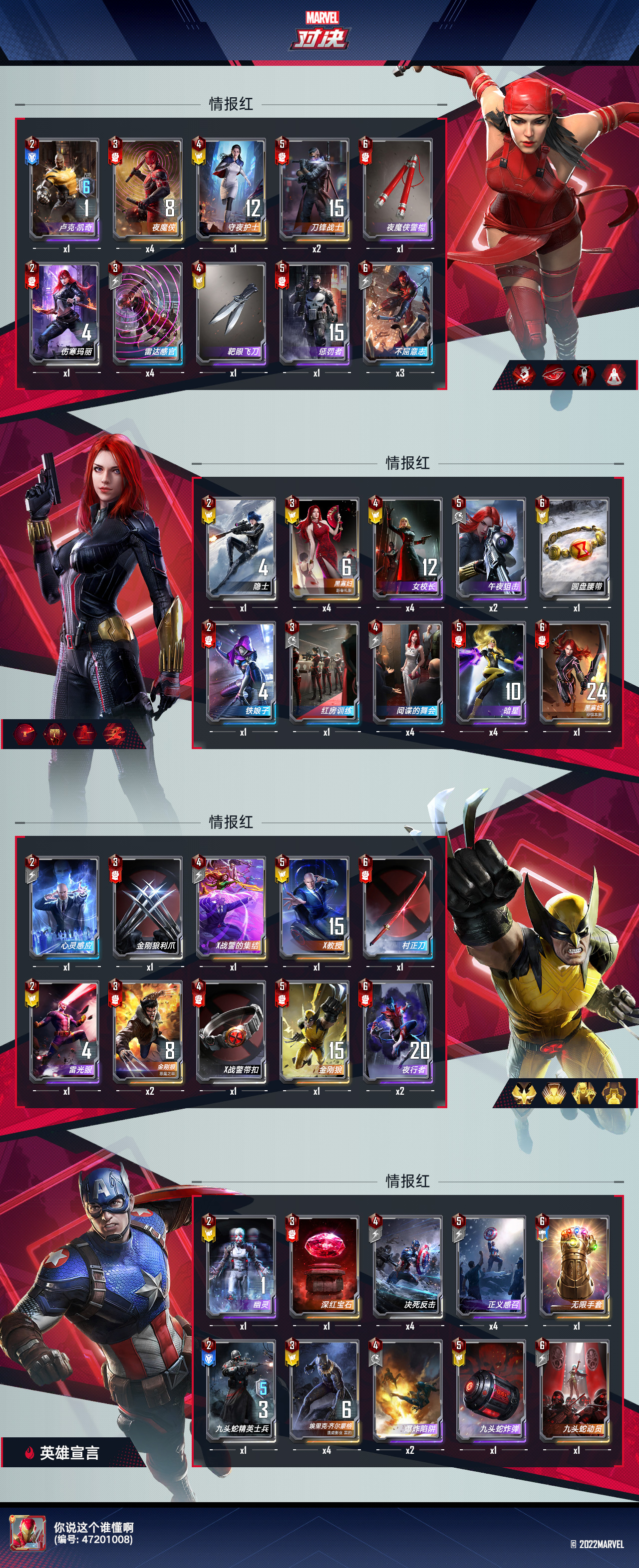 夜魔侠&红宝石:金刚狼削弱之后,夜魔侠的地位提升了不少,虽然前期还是不如三狼,但是配合情报的减攻,后期一击三杀还是没啥问题的。夜魔侠一定要满4,不然打不出终幕,触发不了狂战斧效果。