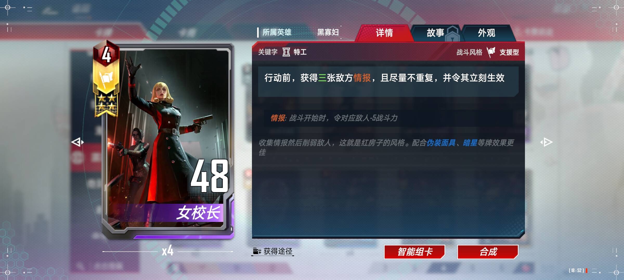 女校长:紫卡,4费12战力,效果强力。后期强力打手,缺情报打不出狙击的时候,常常能带给你惊喜,没有不拉满的理由。