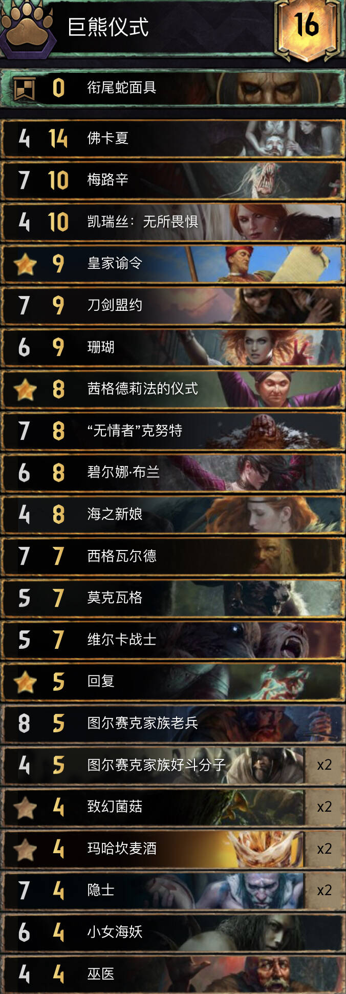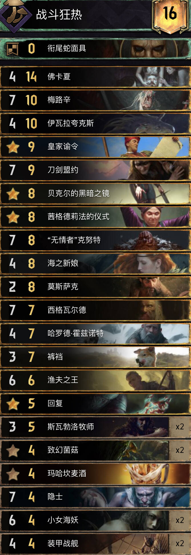 自残体系已经被加强过很多版本,但直到上个赛季,这些变化都没有带来真正的区别。终于,西格和回复获得了巨大的加强,盘活了该体系强大的卡牌,让这个老流派再度崛起,亚登哥也用这套卡组成功夺冠。卡组里包含最好的群岛卡,如佛卡夏和弃牌组件,让联动变得更加灵活高效。
