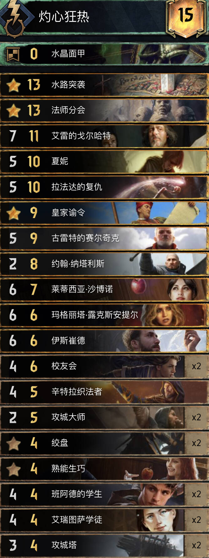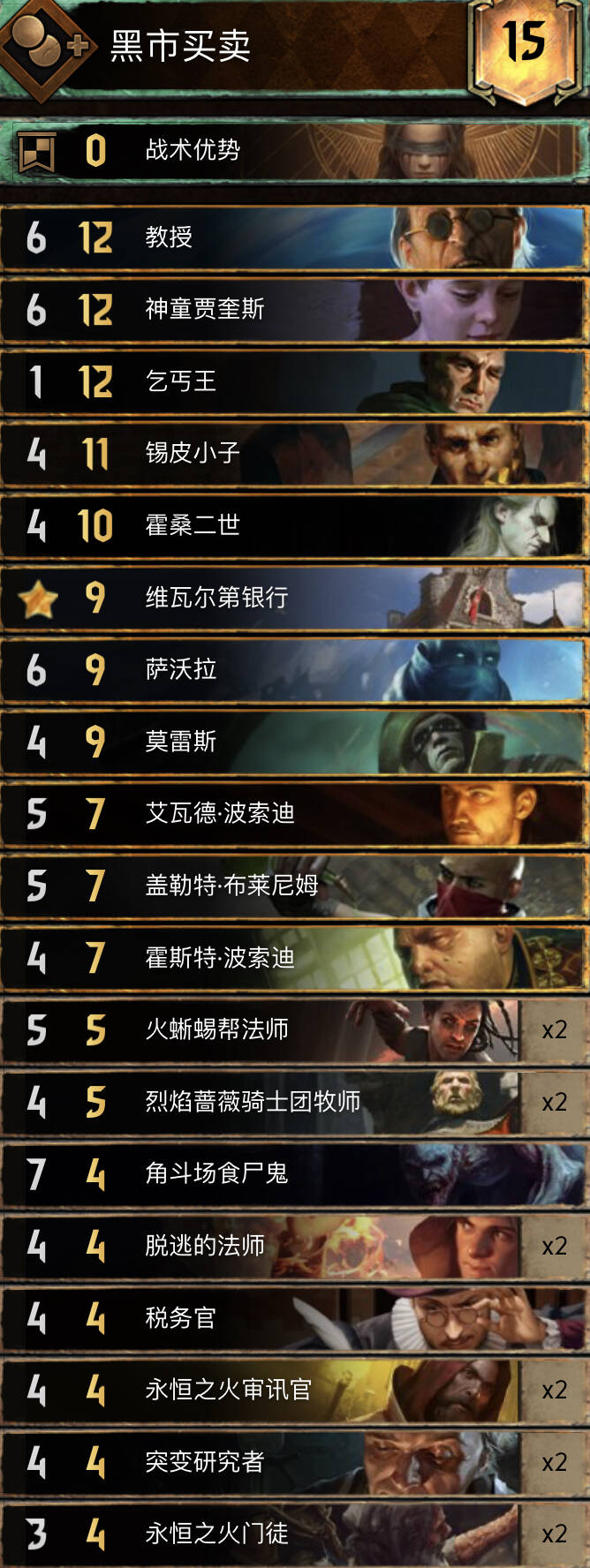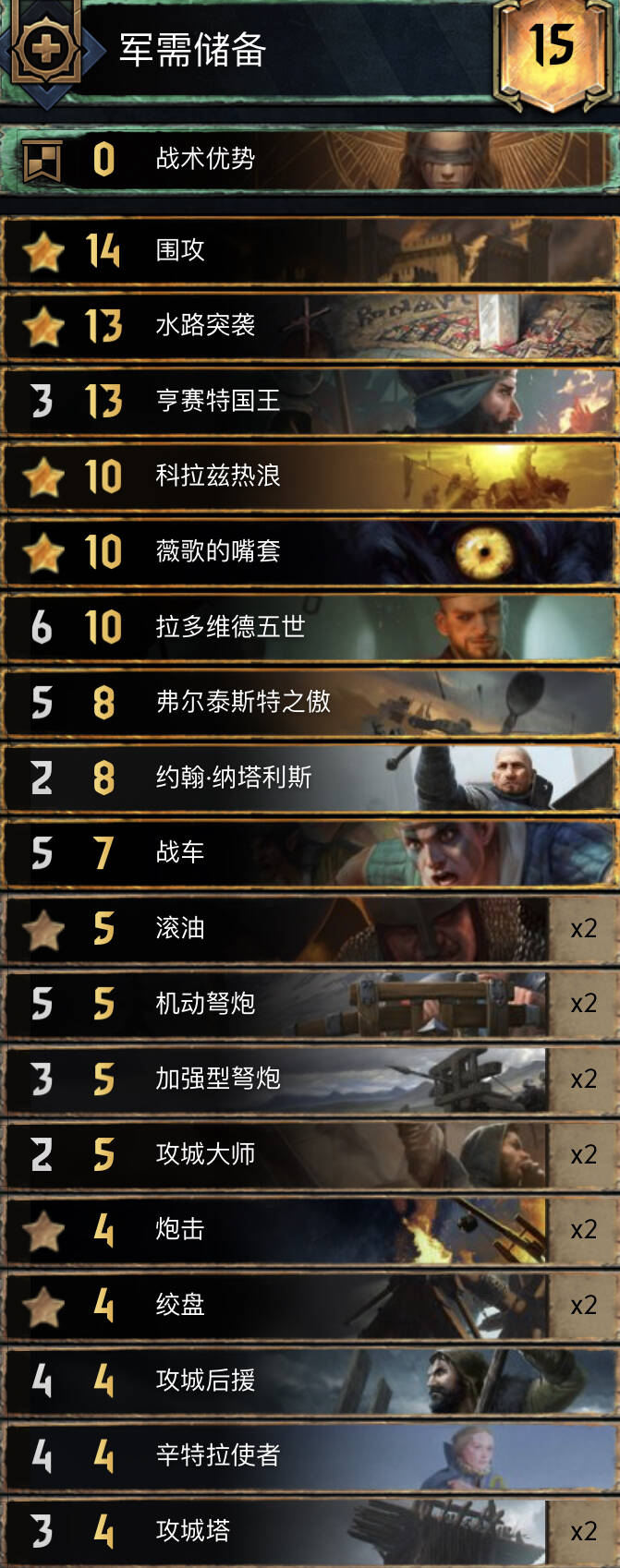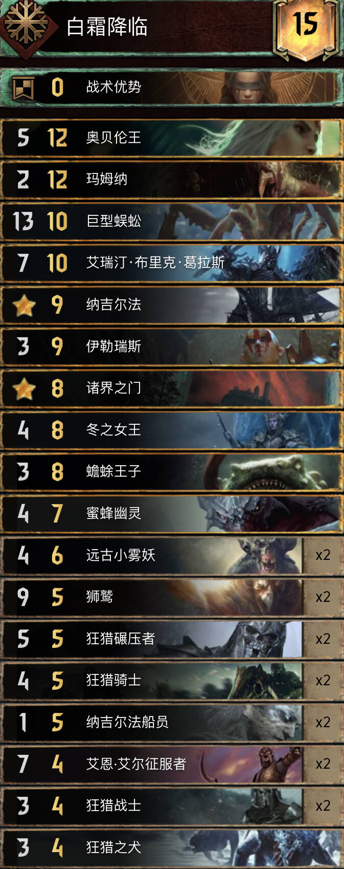 当前环境的北方两大支柱卡组之一,这个版本的削弱等于挠痒痒。在环境中除了使用军需领袖,也有使用狂热领袖的构筑形态。围攻北拥有目前全昆特最凶猛的“清场”组件,经常可以把敌人给剃光头。不过,由于有剧情等核心卡无法被检索,一定程度上还是有些阳寿。