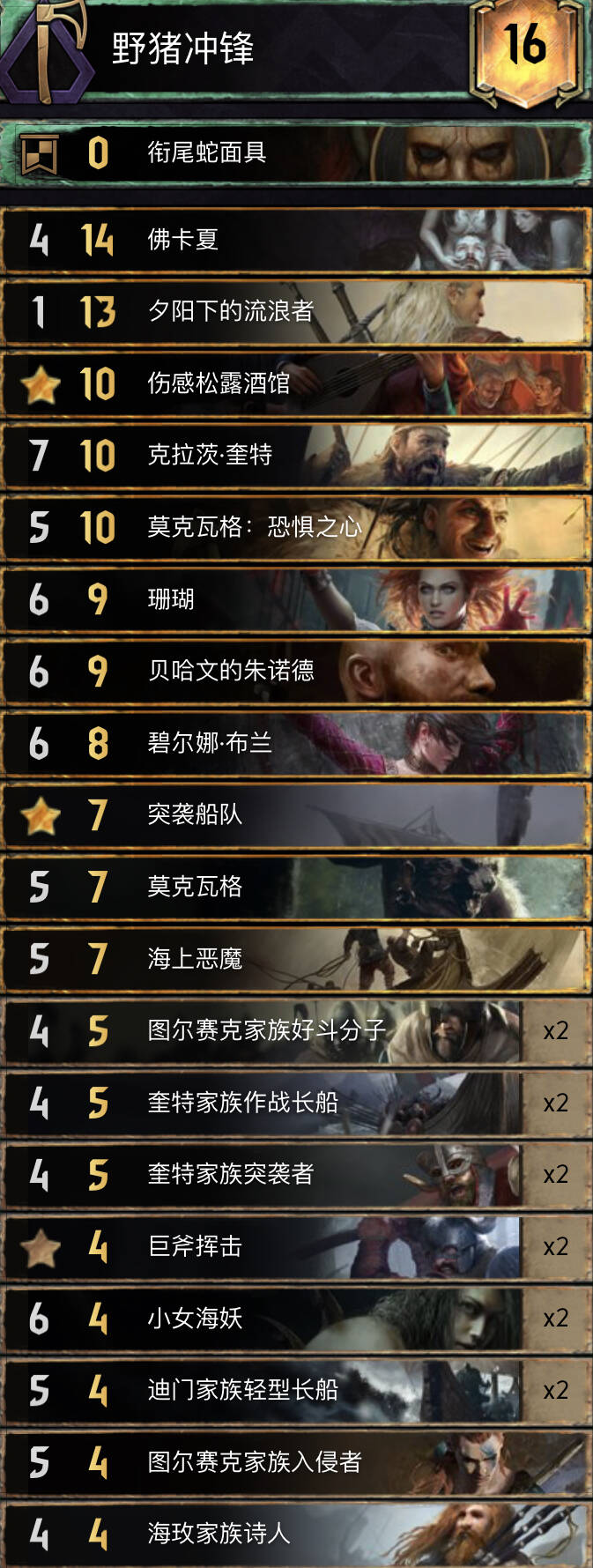 自重做野猪领袖以来,水手们获得了很多加强。卡组在控制方面非常灵活,领袖技能也可以辅助修点。只要你场面上有船只引擎,就可以有效的控制对手的场面。因此卡组的主要打法就是控制对手单位来获得点数,除此之外,你还可以利用弃牌体系来赚取一些优势。
