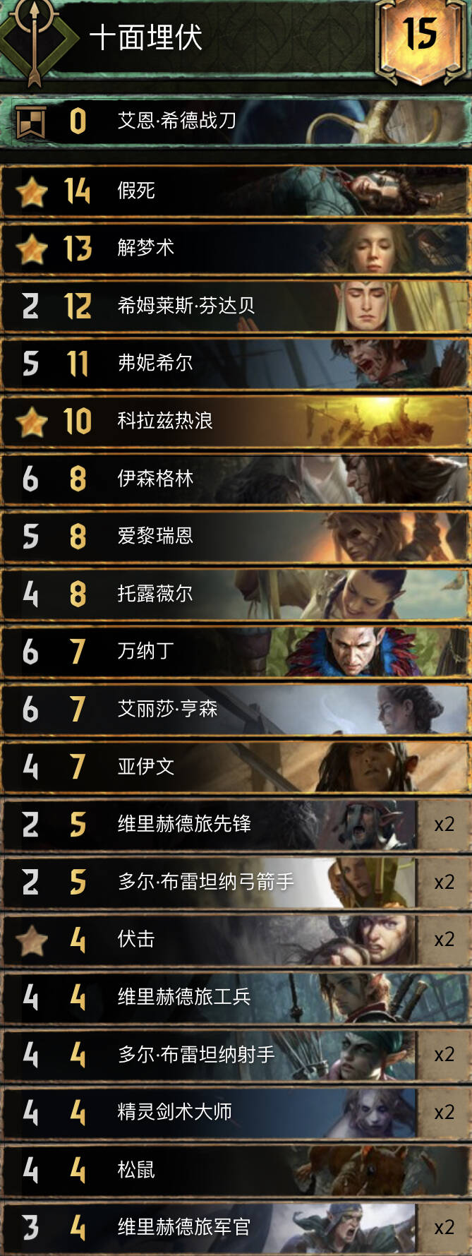 几个赛季后,精灵又回到了天梯环境上。并且,还成为了受欢迎的卡组。这个版本对精灵体系的加强非常大:万纳丁的伏击体系可以提供很多点数。艾丽莎配合法兰爹,一回合打出的4伏击是很大的爆发。而在有必要的情况下,也可以洗回热浪。