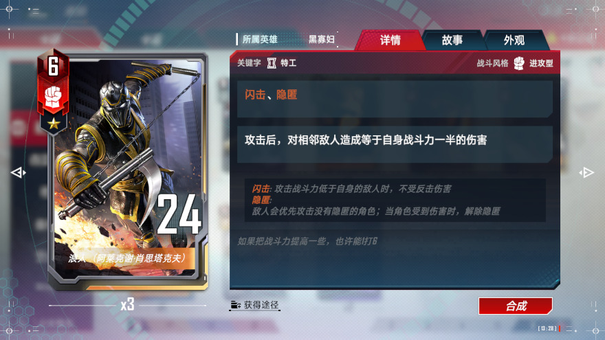 这张卡一般就是用来替代叶琳娜站在一号位的卡,优秀的闪击、隐匿、狂战斧属性,后期基本上可以完成大逆转