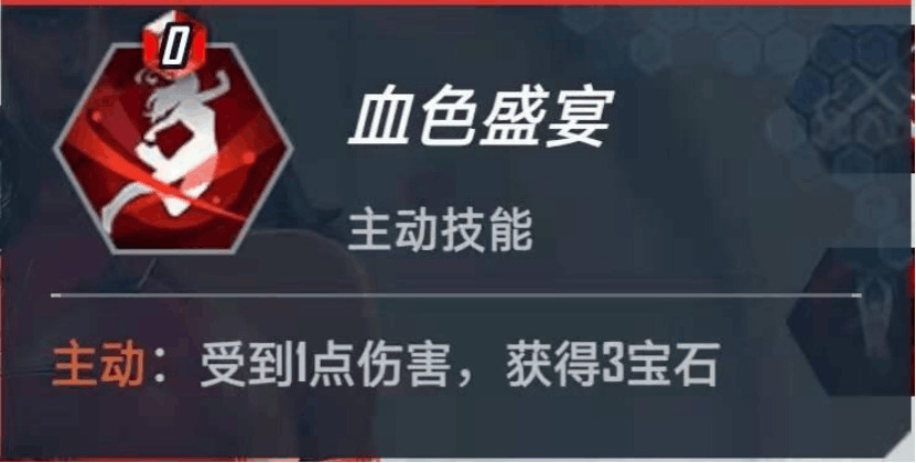很多同学对这个技能不是很了解,血色盛宴是本游戏最强大的经济技能,稳定性远远超过“神力注入”和“蛛网战士”,每回合可以固定获得3宝石,按照国服平均10回合来算,本技能一般都能获得21宝石,加上一般有该技能的时候,经常送4宝石(一般来说,使用艾丽卡同学不多的对局中,基本都是送4宝石,最差也是送2宝石),所以血色盛宴经常可以给整场比赛带来25个左右的宝石。