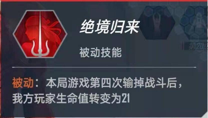 绝境归来非常适合本卡组,尤其是前几回合已经输过一两次的时候,只要挺住一两次失败后,触发四败技能,直接奶到21血,简直不要太爽。