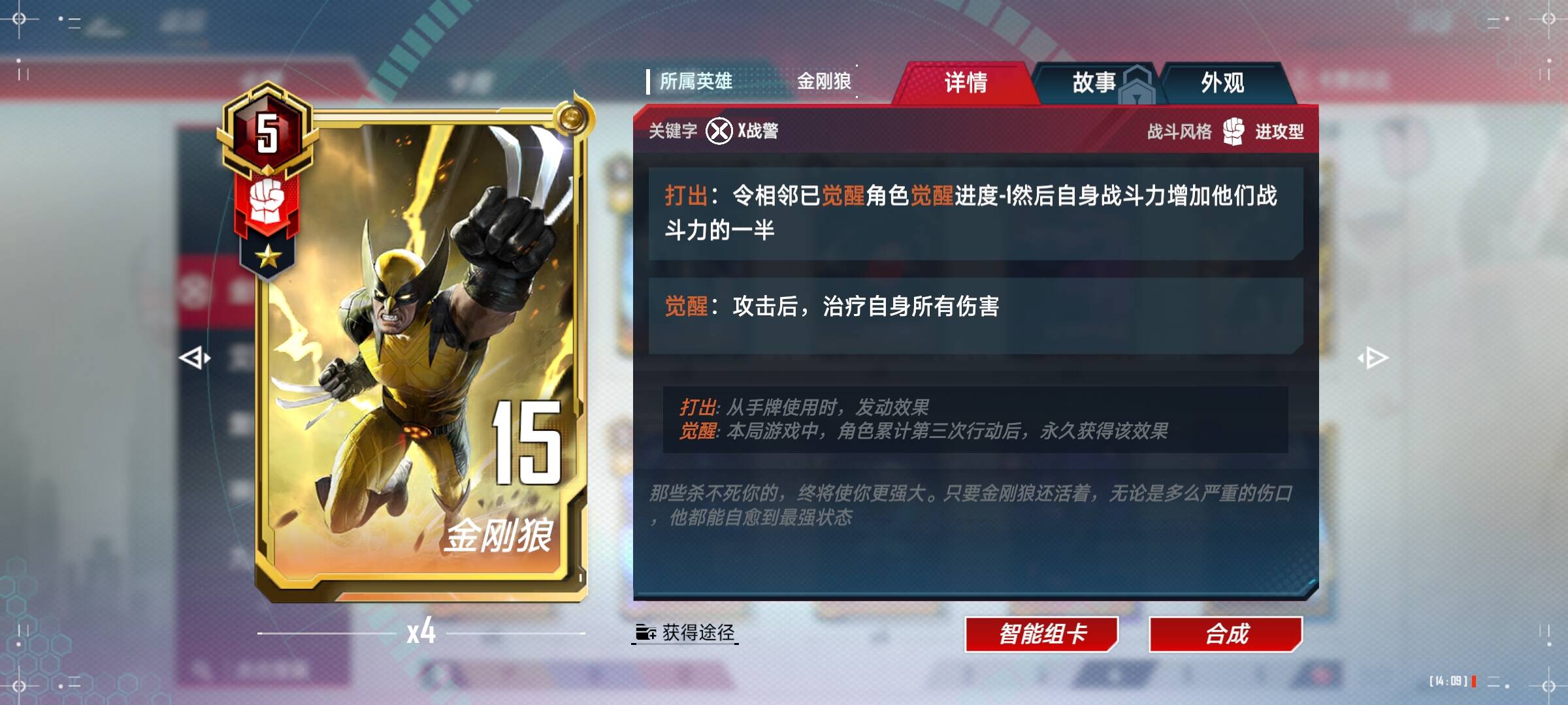 第四回合:获得技能,多核以玩法多样性为核心,没有绝对的T0技能,主要是根据场上的局势选择相应的技能,比较通用的是金刚狼的凤凰爆发、基因突变、野兽本能,艾丽卡的血色盛宴、死亡重生,钢铁侠火力全开、升级改造,连败时四败技能都是好技能,没有三狼和夜魔侠时看到4块钱的能量核心也不用犹豫了,想啥呢发牌员已经明示你上本了。