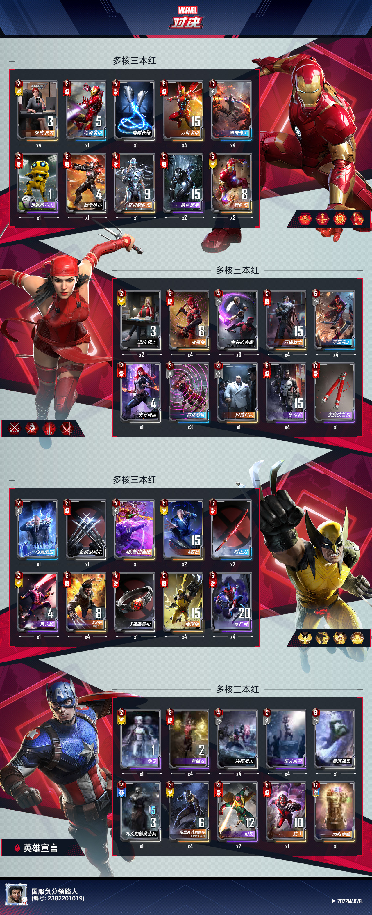 大家好,我是小鱼棵棵棵,来自暮狼回乡战队。这次我们给大家带来的卡组是多核三本红,卡组以艾丽卡、金刚狼、钢铁侠组成。作者赛季末用多核三本红6小时战斗30局(其中吃鸡10局,第二6局,第三7局,第四和五各3局,老六一局),吃鸡率33.3%,前三率76.6%,6小时上分3500分最终确保了天梯前百,胡了入人疼,不胡转型快能烂分,适宜天梯上分冲榜。