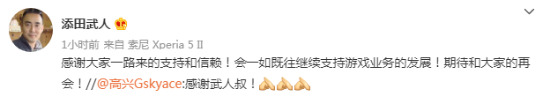 添田武人在个人微博称:“感谢大家一路来的支持和信赖!会一如既往继续支持游戏业务的发展!期待和大家的再会!”